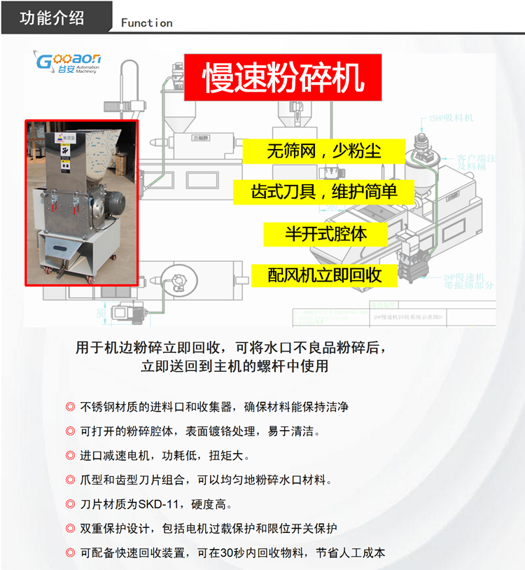 • 簡介:谷安慢速粉碎機(jī)適用于注塑機(jī)機(jī)邊粉碎,物殊物料集中粉碎,硬質(zhì)電子件粉碎