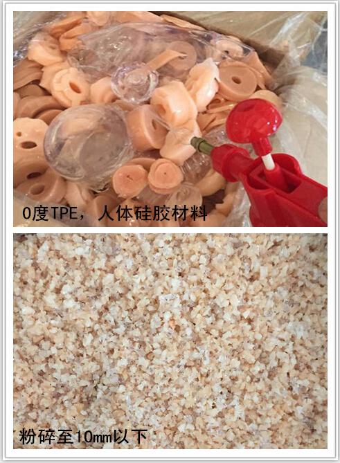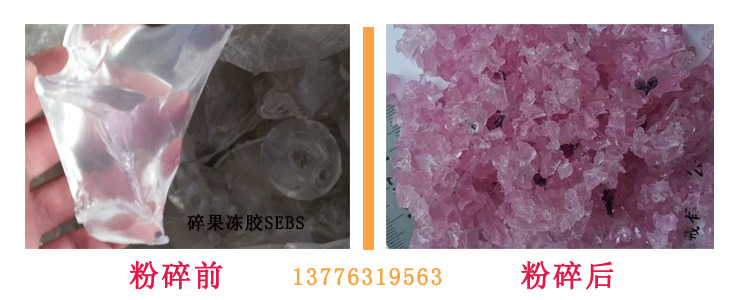 果凍膠粉碎,0度膠粉碎,彈性物料粉碎機(jī):可粉碎軟膠,彈性體如:TPE,TPR,TPU,TPV,PU,SEBS,硅膠等軟性塑料,且可以24小時(shí)連續(xù)工作,不粘刀,不結(jié)團(tuán),不堵篩網(wǎng)。