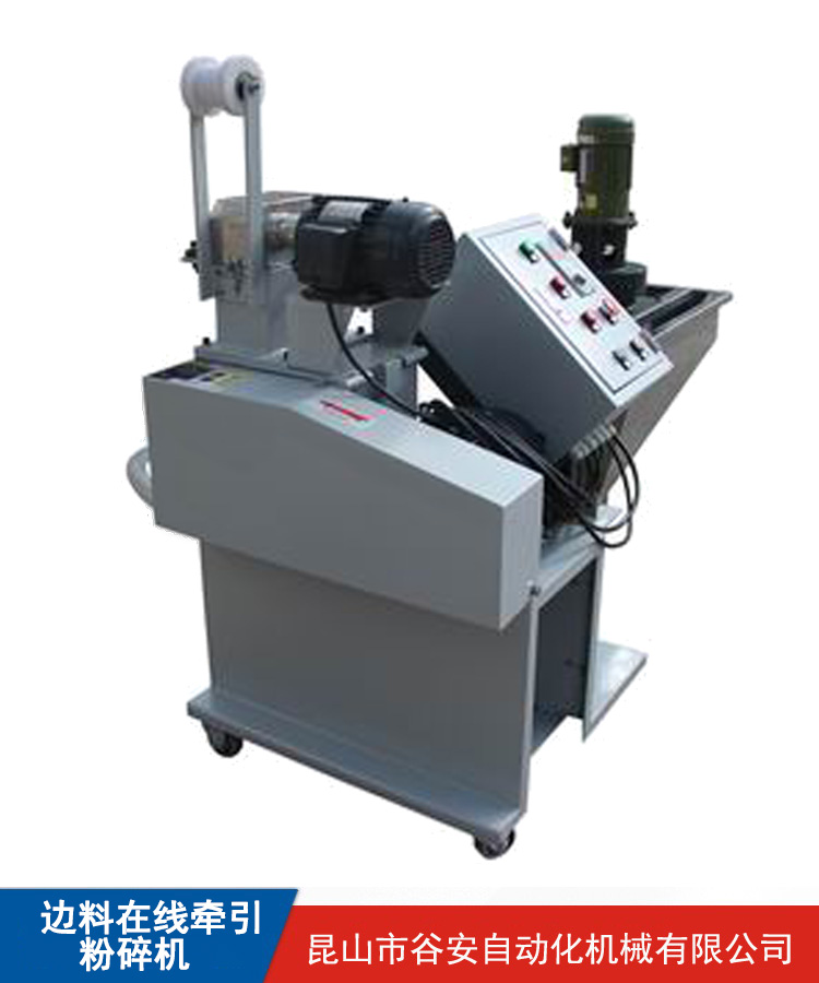 一般用于薄膜邊角料,板材邊角料等押出機生產線在工作時,將不合格產品,或兩條邊料在產生的同時,自動經牽引系統拉入粉碎機粉碎.并且拉入的速度可調整到與出料速度同步.如此一來,片材在產生后就立即得以粉碎,不會因收卷,搬動而產生污染,吸收水份導致氧化