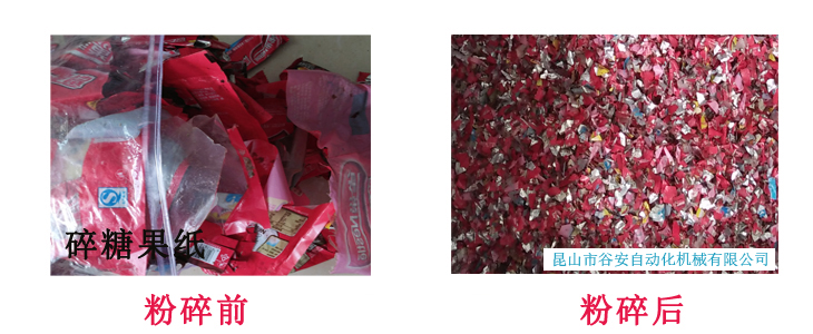 谷安包裝袋粉碎機,針對藥品包裝袋,糖果紙,日用品包裝袋,化工品包裝袋,食品包裝袋等重量輕,易纏繞,不下料的特點,自主研發(fā)一字刀軸,刀具成V字型排列,旋轉(zhuǎn)過程中剪刀式剪切粉碎。