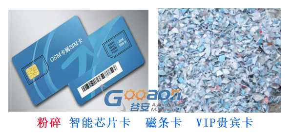本系列機型專為粉碎IC卡粉碎,磁條卡粉碎,芯片卡粉碎設計,可粉碎并破壞智能卡中的金屬芯片,磁條等.并將卡片粉碎成3-5mm的顆粒.